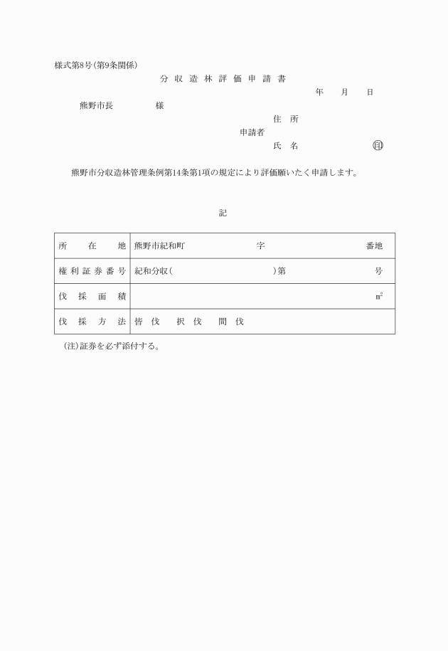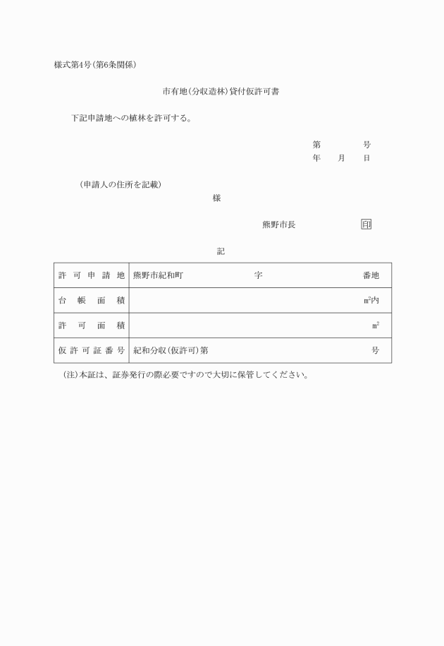 第7条 条例第9条第1項ただし書に規定する植林期間延長の許可の申請は、市有地(分収造林)植栽期間延長申請書(様式第5号)により行うものとする。