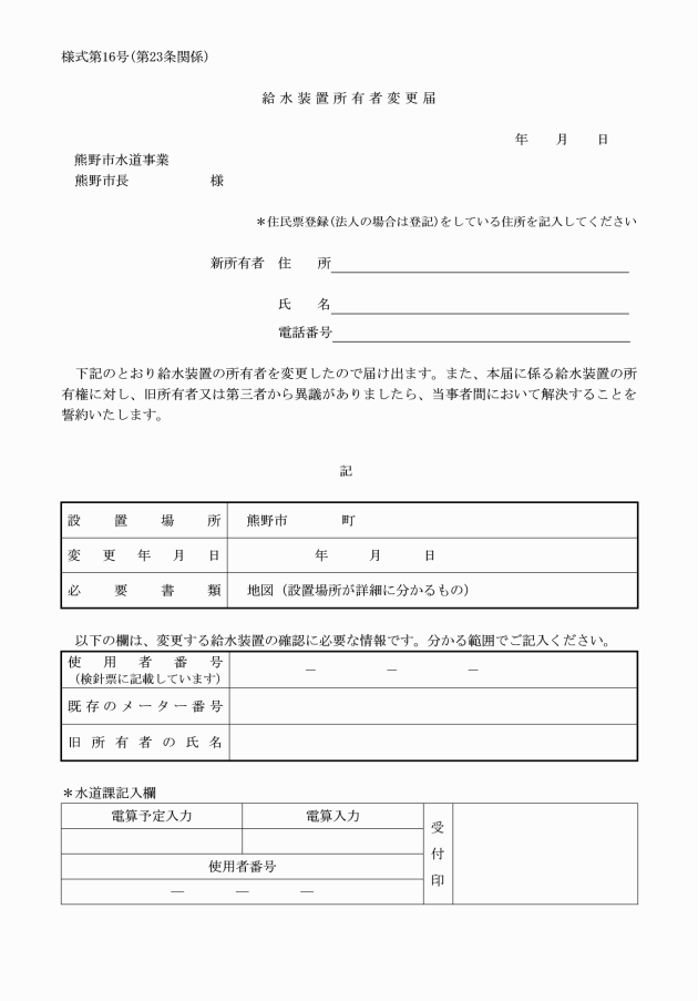 (4) 給水装置所有者に変更があったときは、給水装置所有者変更届(様式第16号)の提出をもって行う。