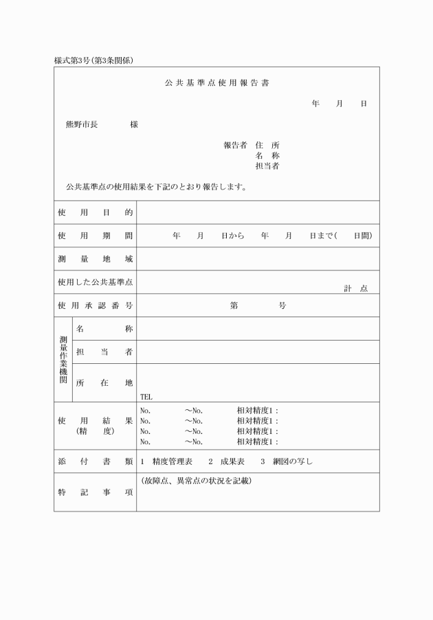 2 公共基準点を使用する者は、公共基準点の使用後には公共基準点使用報告書(様式第3号)により使用結果を市長に報告するものとする。